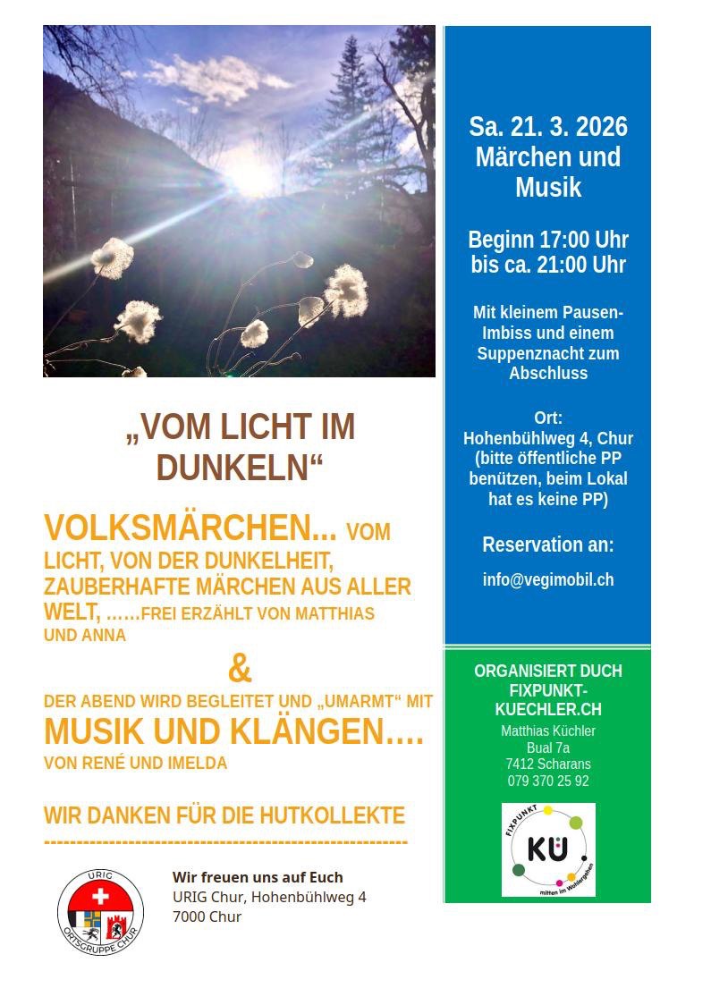 Erfreust du dich an frei erzählten Volksmärchen? Schliesse deine Augen, komm mit uns auf die Reise in ferne Kulturen, die Märchenwelt, die Wegbegleiter auch in der heutigen Zeit.